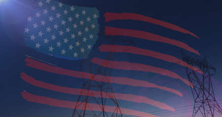 US flag on electric field background. Power shortage and increased energy consumption in US. Energy crisis in US