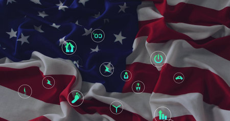 Displaying draped American flag in digital art, with circles showing green energy icons. Patriotism, sustainability, eco activism, digital illustration, environmental awareness, renewable energy, civic pride