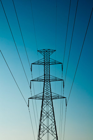 electricity transmission pylon silhouetted against blue sky at dusk