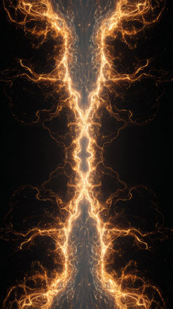 Electric energy lightning glowing abstract dark background symmetric fractal spark golden futuristic mood flows electric energy lightning glowing