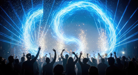 An excited crowd raises their arms toward a large, glowing blue formation. The scene features bright light against a dark backdrop. The composition suggests an energetic atmosphere, suitable for various editorial and commercial applications. The dramatic lighting and visual effects could be used to illustrate concepts such as technology or special events.