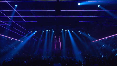 music brand showing on stage or Concert Live and Defocused entertainment concert lighting on stage with Laser rays beams, party concept
