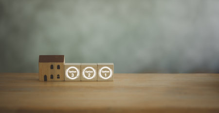 Icons of Options 1, 2 and 3 on wood block and model home choosing suitable housing for best option to buy a home. Real estate and asset management concept. choose the best property with your rights.