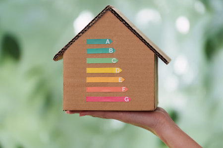 Wooden house model energy efficiency rating colorful scale sustainable eco friendly rustic background concept environment