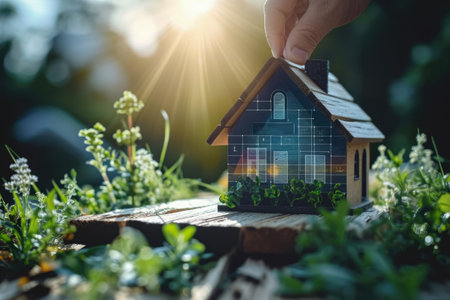 Hands cradle a miniature eco-friendly house adorned with solar panels and lush greenery, symbolizing sustainability. The modern design is highlighted by natural sunlight in a cinematic style.
