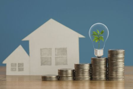 pile of money coins with small green tree, light bulb and paper home,on wood and soft blue background, concept in fiance, loan and buying