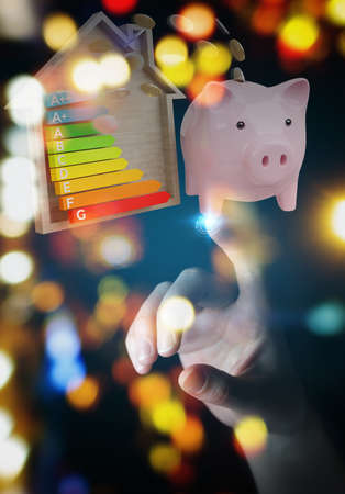 An individual presents a luminous bulb alongside a vibrant, house-shaped energy ratings chart, illustrating innovative solutions for eco-friendly energy management a