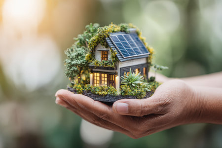 a hand holding a small model house with prominent solar panels installed on its roof, highlighting the role of renewable energy in eco-friendly living
