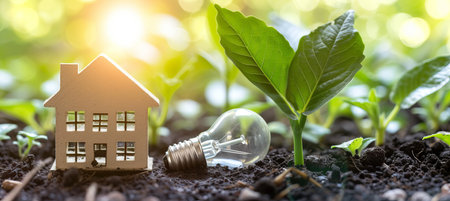 A wooden house shape stands on dark soil next to a glowing incandescent light bulb. The background is a blurred green bokeh.
