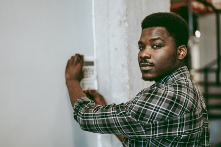 Male hand try to turn on the new air condition in room, in the hotel room. African man hands on the air conditioning control panel. Hand setting temperature air condition.