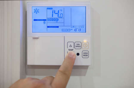 Male hand pushing the button of home heating and cooling system control unit, closeup with selective focus
