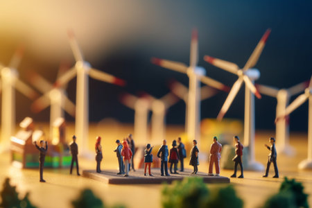 Miniature workers near solar panels standard illustration capturing the concept of renewable energy and sustainable practices in a miniature world.