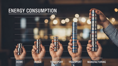 An industrial area shows energy production facilities with smoke and data graphs overlaying the scene.