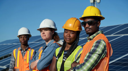 Renewable Energy Revolution - A power plant or wind farm with workers installing new equipment to generate renewable energy sources for the future