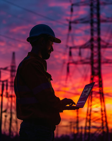 An engineer stands in silhouette, observing a network of power lines and electrical infrastructure at dusk. The sky displays vibrant hues of orange and blue, creating a dramatic backdrop. This imagery might be suited for projects related to energy, technology, or industrial contexts, including editorial and commercial purposes.