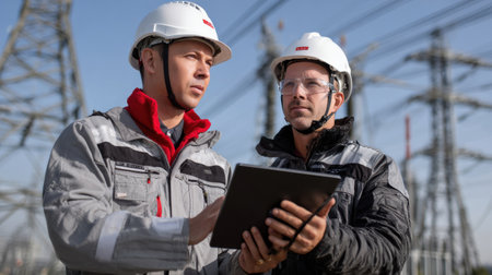 Two men wearing hard hats and safety gear are looking at a tablet. They are discussing something important