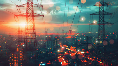 Amidst a dusky skyline, towering electrical pylons rise, silhouetted against vibrant hues of blue and orange. Bright city lights twinkle in the background as vehicles glide by.