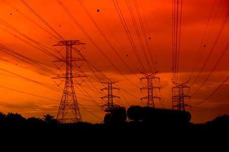 High voltage electric pole and transmission lines in the evening. Electricity pylons at sunset. Power and energy. Energy conservation. High voltage grid tower with wire cable at distribution station.