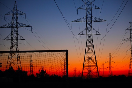 Electric towers silhouetted against a vibrant sunset with colorful clouds
