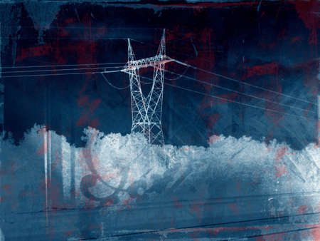 Industrial landscape at dawn with monochrome effect, high voltage towers and wind turbines