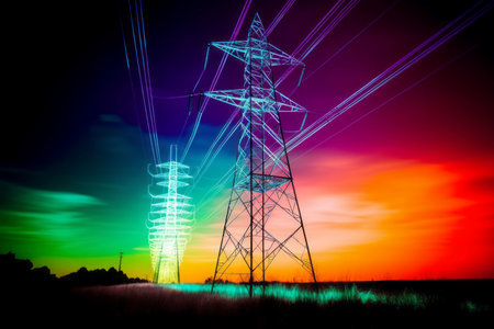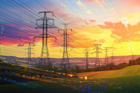 Electric power towers tower over a landscape at sunset, with vibrant colors creating a digital overlay that adds an artistic touch to the scene.