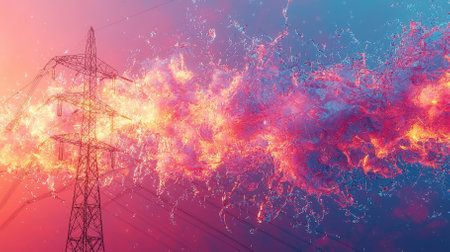 A striking image of a power line intertwined with a colorful, energetic flow, capturing the essence of dynamic energy and innovation in a vibrant gradient backdrop.
