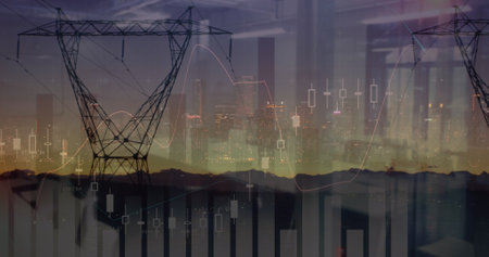 Displaying towers and power lines stretching rural plain at dusk, with financial chart overlays. Infrastructure, energy, utility, technology, data visualization, financial analytics, rural landscape