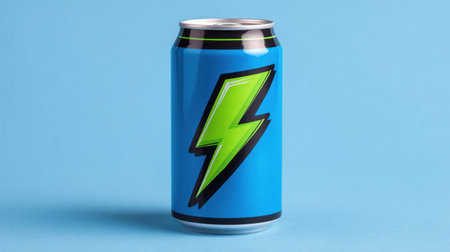 A vibrant blue energy drink can featuring a striking green lightning bolt graphic, perfect for product promotions, advertising, and design presentations.