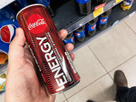 BELGRADE, SERBIA - JUNE 29, 2021: Coca Cola Energy logo on a can for sale in Belgrade. It is the energy drink with caffeine and guarana produced by the coca cola company.