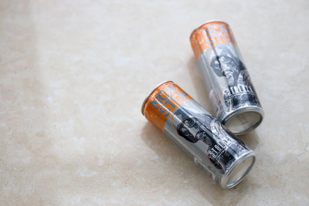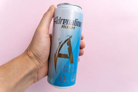 Tyumen, Russia-October 15, 2021: Adrenaline rush energy drink, metal can zero sugar. Copy space