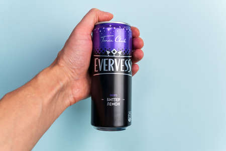 Tyumen, Russia-December 27, 2021: Evervess bitter lemon can. This refreshment drink produce Pepsi company.