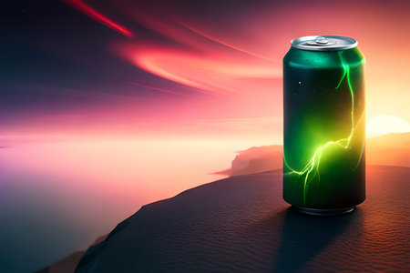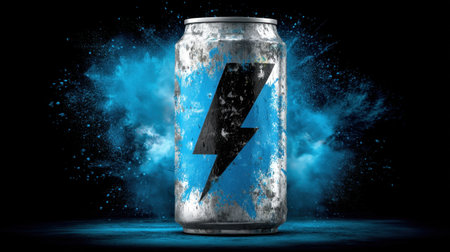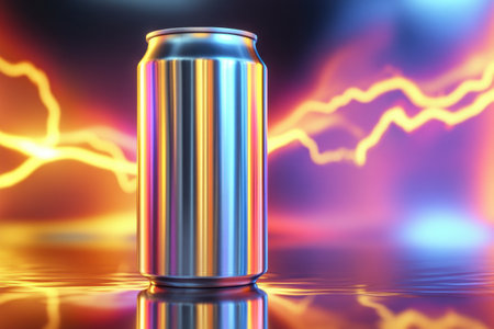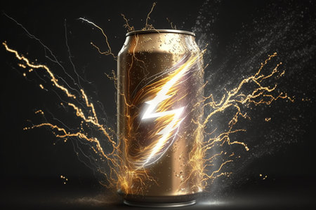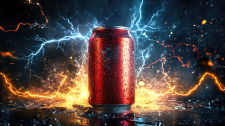 An aluminum can of energy drink, surrounded by dynamic lightning flashes, conveying power and refreshment