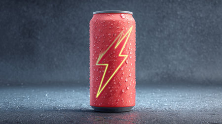 A vibrant red beverage can featuring a striking lightning bolt design, covered in condensation droplets, set against a dark textured background ideal for marketing.