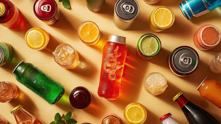 A stunning arrangement of metallic beverage cans in vibrant colors against a soft gradient background, showcasing a modern and artistic aesthetic perfect for refreshment themes.