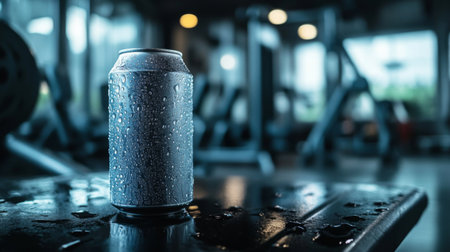 A solitary can of beverage with droplets of water sits on a table in a gym. The blurred background features workout equipment, enhancing the vibrant fitness atmosphere.