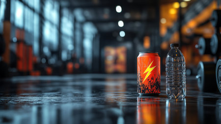 Refreshing energy drink and water bottle on gym floor during workout session in modern fitness center. Generative AI