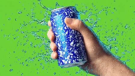 A vibrant soda can featuring an electric blue lightning bolt logo. Surrounded by droplets, this visually striking image showcases modern packaging design and refreshment appeal.