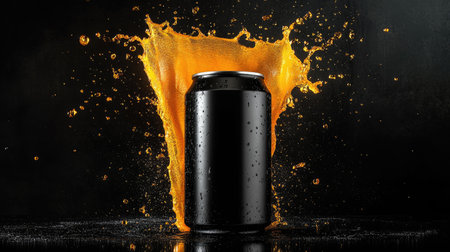 A striking image of a black beverage can surrounded by a dynamic splash of orange liquid, set against a dark backdrop that enhances its vibrant colors.