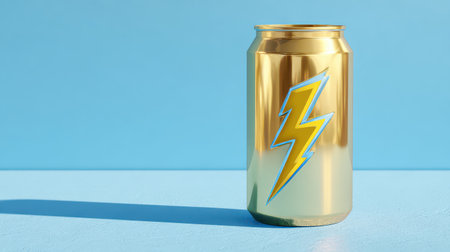 Metallic Gold Can with Blue Lightning Graphic Against a Light Blue Background, Stylish Beverage Container for Creative Marketing and Design Projects