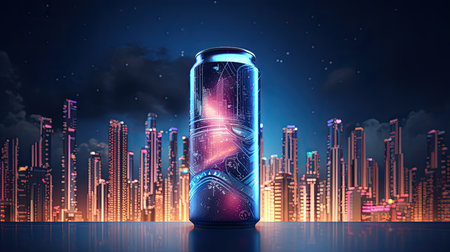 Aluminum can of soda drink with glowing city background. 3D rendering