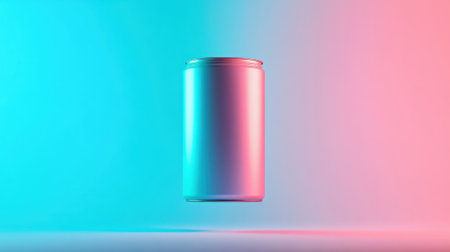A modern, sleek can floating gracefully in a vibrant pink and blue background, perfect for beverage and product promotions.