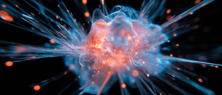 An abstract illustration shows energy bursts in a dark environment. Vibrant streaks of orange, blue, and purple emanate from a central point. The visual style features digital artistry with glowing effects. Suitable for designs requiring dynamic and visually impactful elements, also suitable for editorial or commercial purposes.