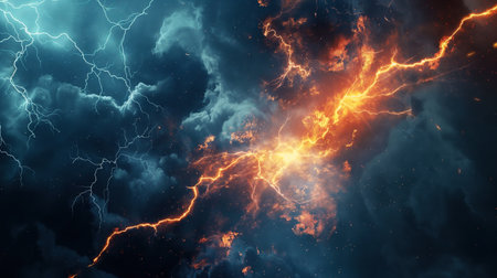 AI Generated. Explosive clash of blue and orange lights in darkness represents the dynamic conflict between light and darkness