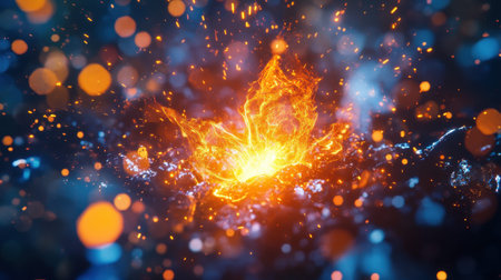 A stunning visual showcasing a vibrant fiery explosion surrounded by glowing sparks and colorful lights, creating an intense abstract atmosphere.