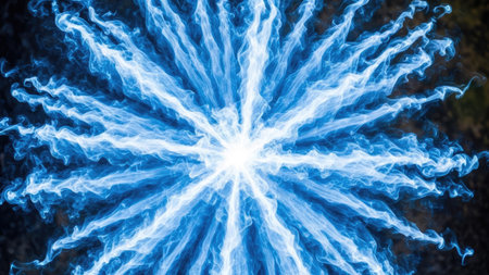 This abstract a powerful explosion of light and energy against a deep black background. A central beam of bright blue light radiates outwards, illuminating a field of smaller blue particles and streaks. Intertwined with the blue are intricate, branching strands of shimmering gold, resembling lightning or cosmic tendrils. The composition creates a sense of immense power, creation, and cosmic wonder, with a futuristic and ethereal feel. The contrast between the dark background and the vibrant...