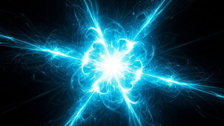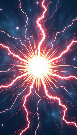 A stunning visual of a radiant explosion emanating from a central point, surrounded by vibrant, jagged lightning bolts. This electrifying image captures the essence of power and dynamism, evoking feelings of awe and excitement as the light contrasts against a deep blue backdrop.