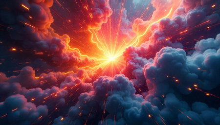 Energetic abstract cloudscape with vibrant light and bokeh effects
