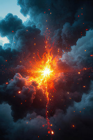 Bright reds and oranges burst through dark clouds, creating an explosive visual spectacle. Sparkles of light mingle with smoke, enhancing the dramatic effect of the eruption.