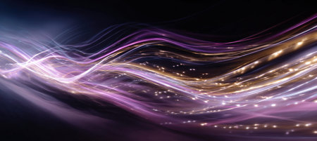 Smooth purple and gold light trails flow gracefully across a dark background, creating an abstract and visually captivating scene with a touch of magic