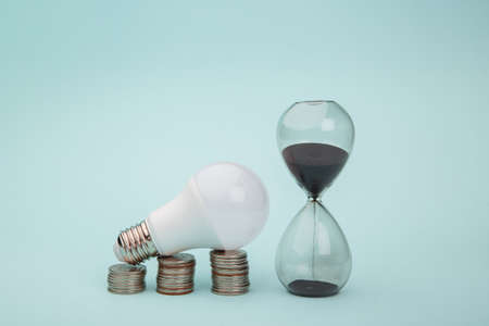 Concept of rising electricity prices. Lamp and coins.